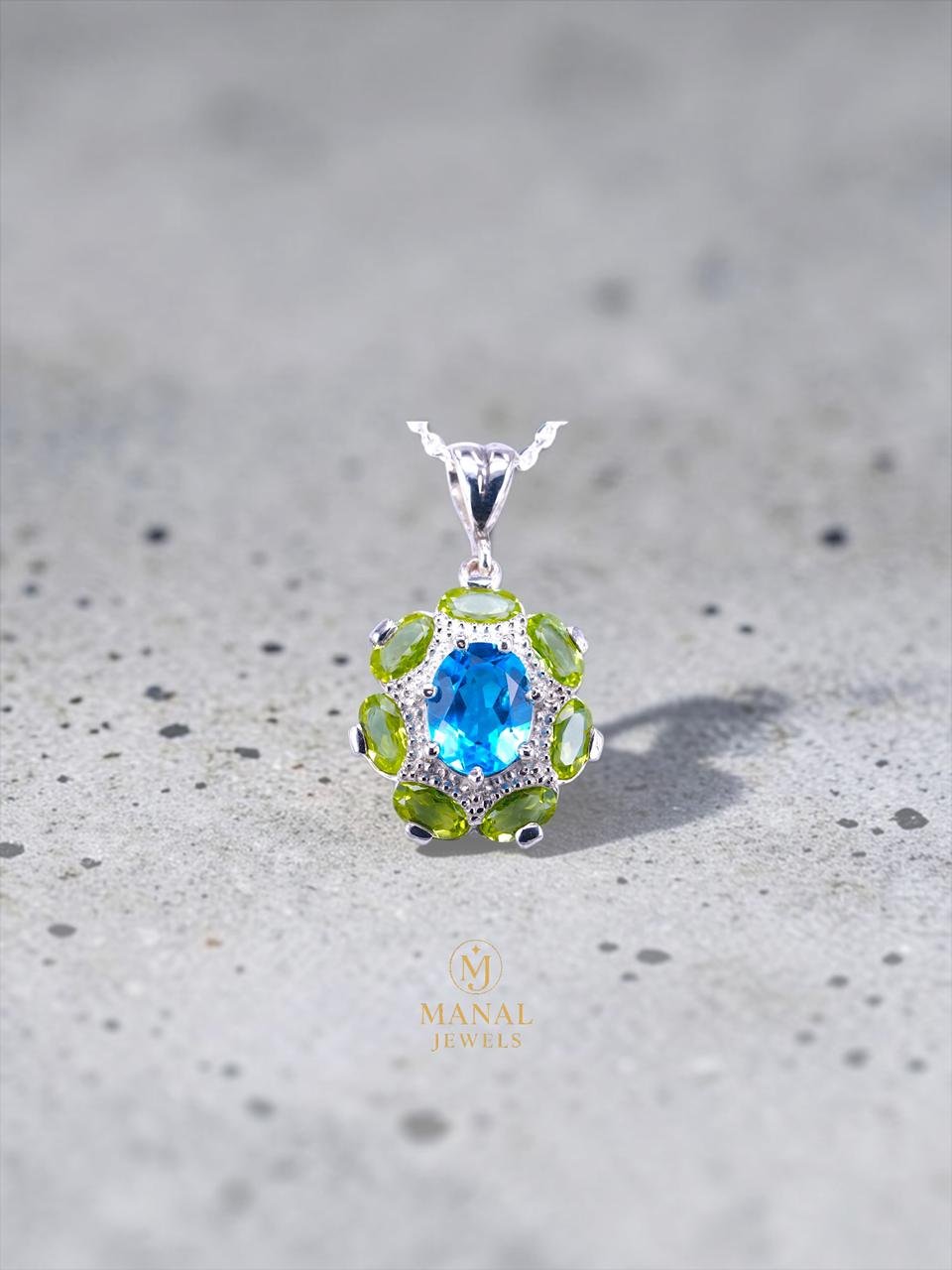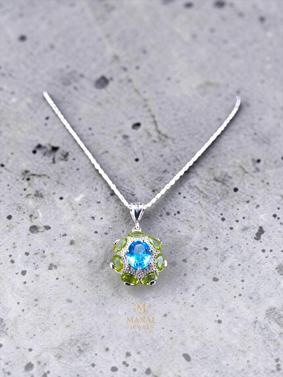 Blue Topaz & Peridot Cluster Pendant in 925 Silver